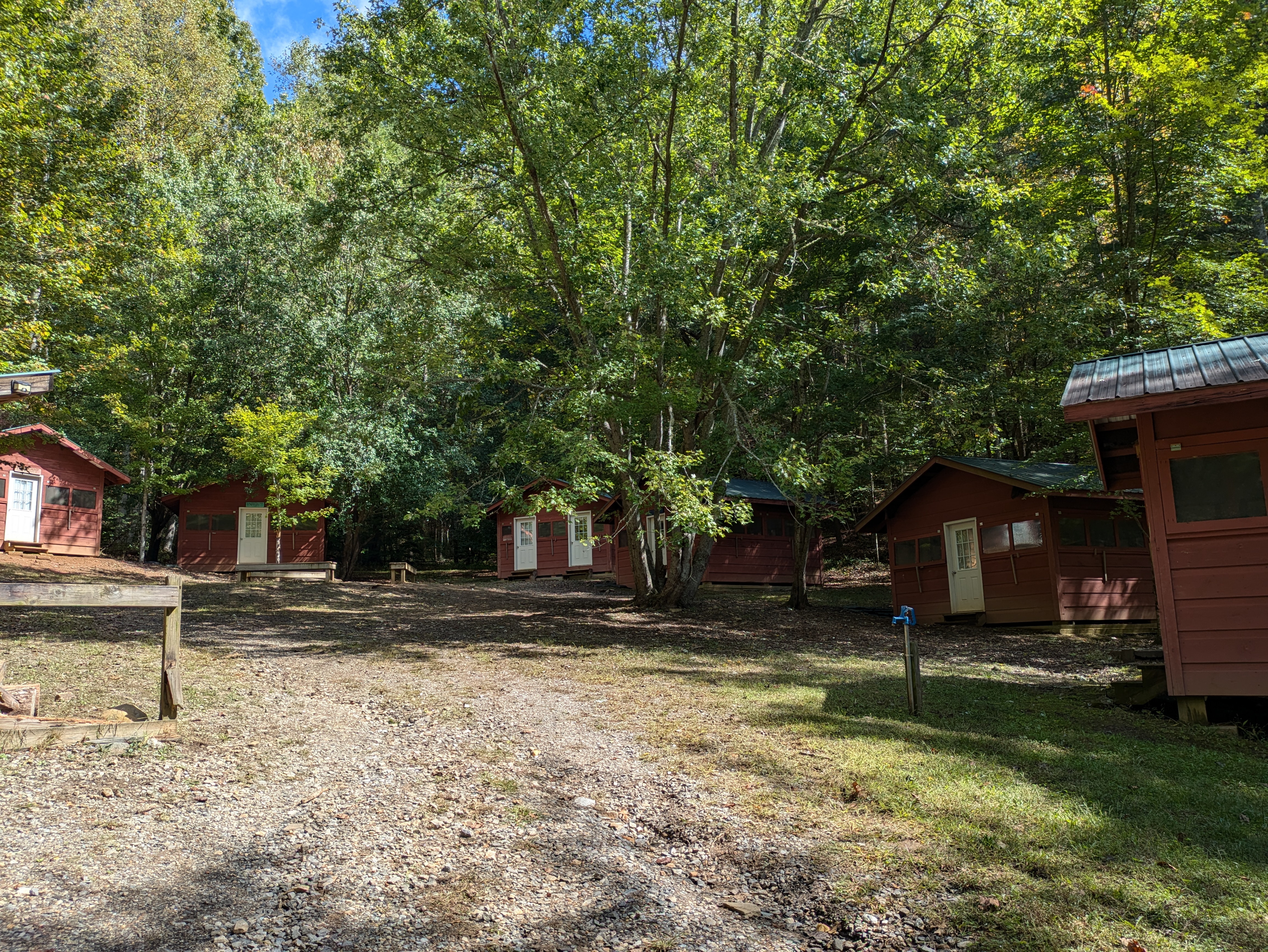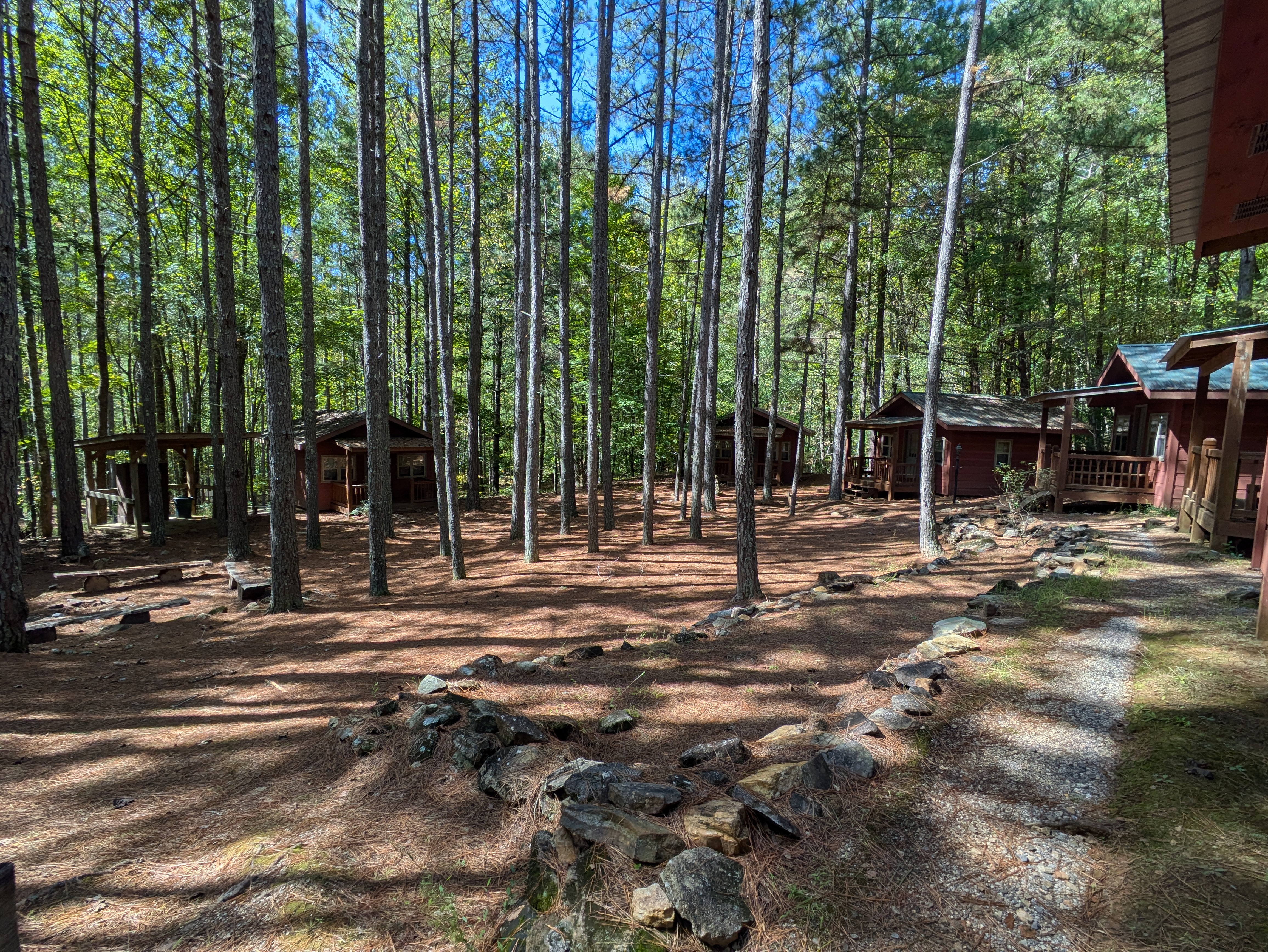 Our Group 1 cabins are uniquely equipped to provide a fully powered experience for guests. Each of the six individual cabins is equipped with air conditioning, heating, ceiling fans, and lighting, ensuring a pleasant stay no matter the weather or season. Altogether, these cabins can accommodate up to 34 campers. Within the cabin group, there is a dedicated shower house, which offers hot running water and includes three private showers and three toilets for guest convenience.