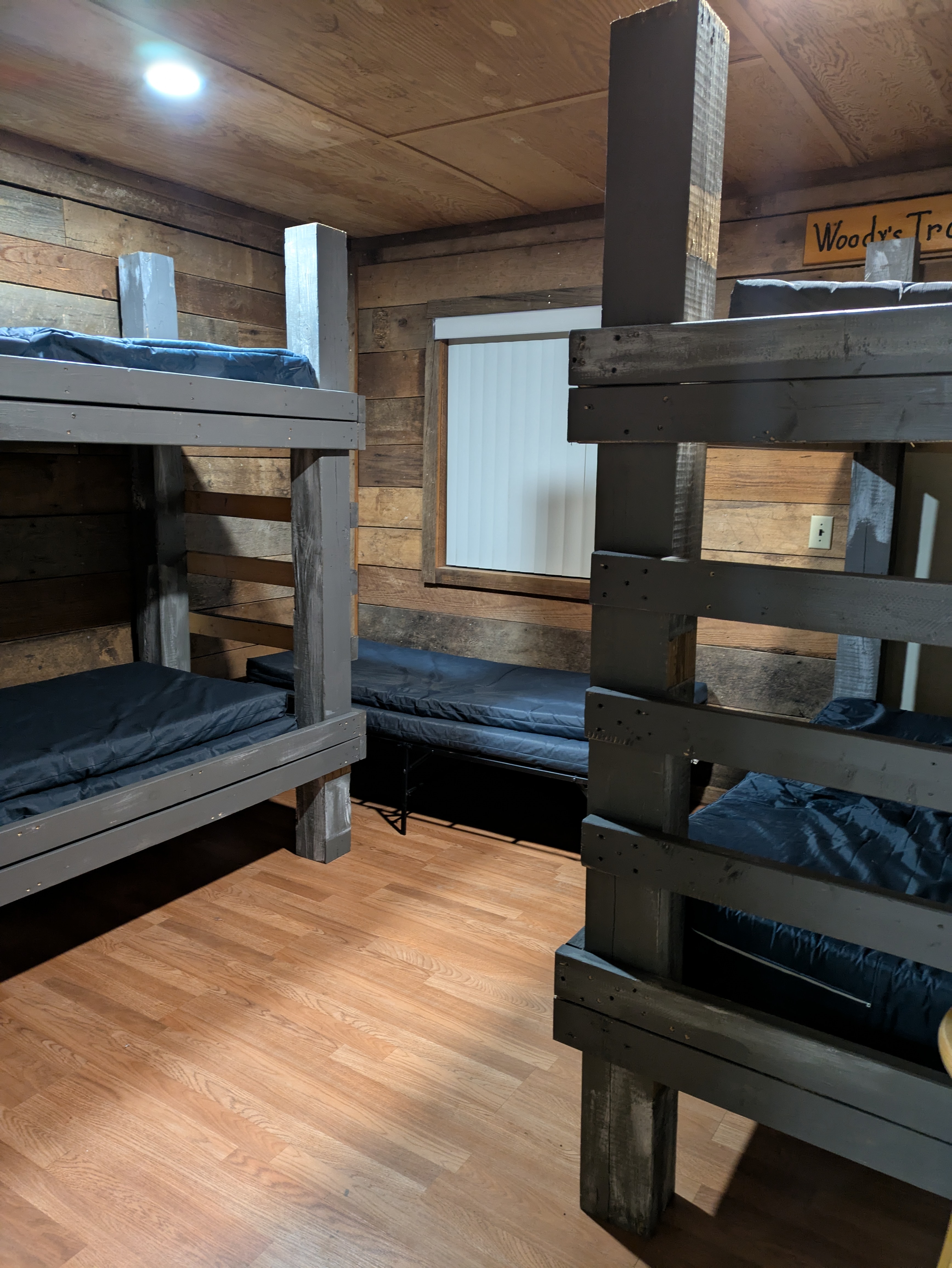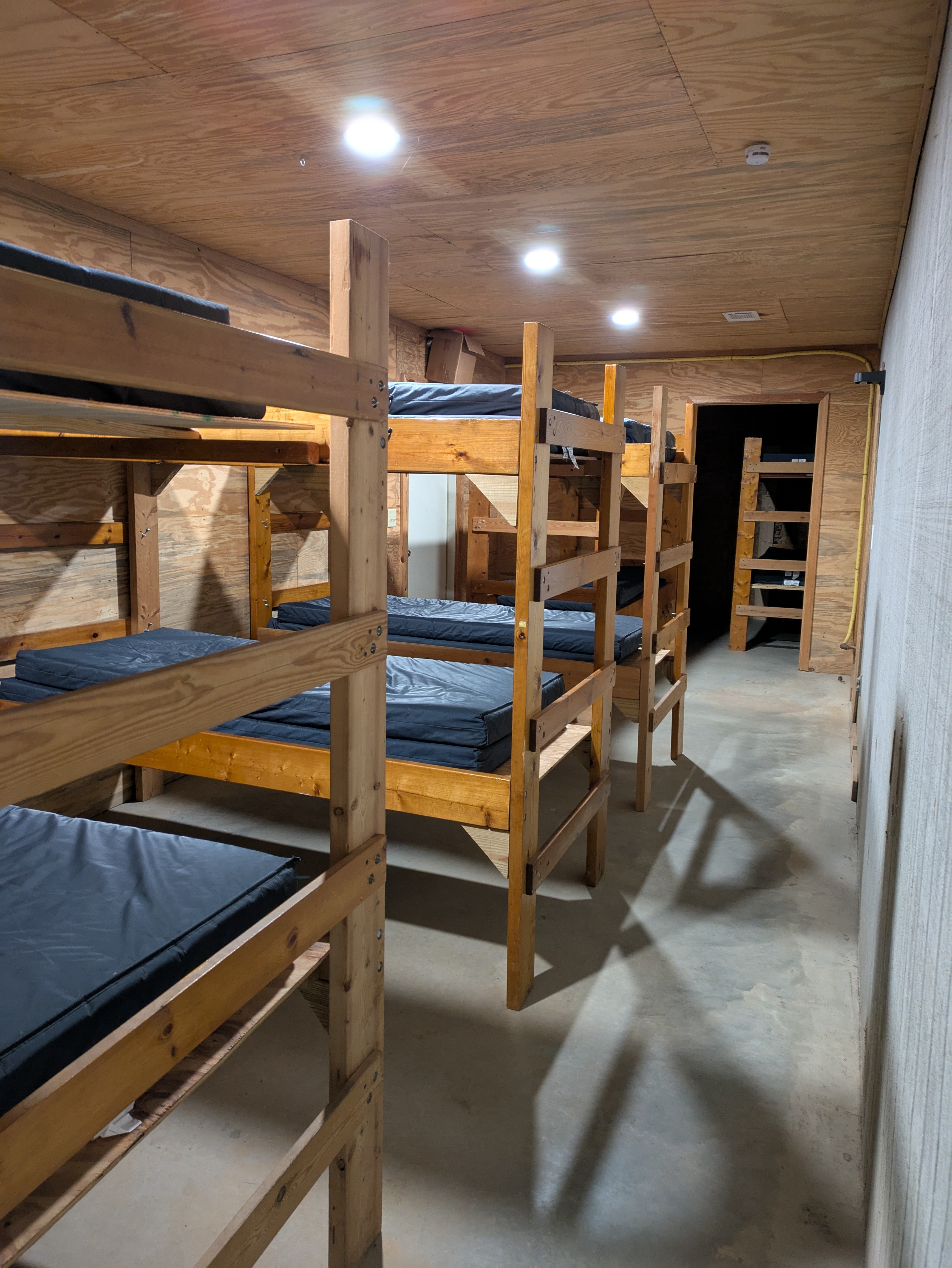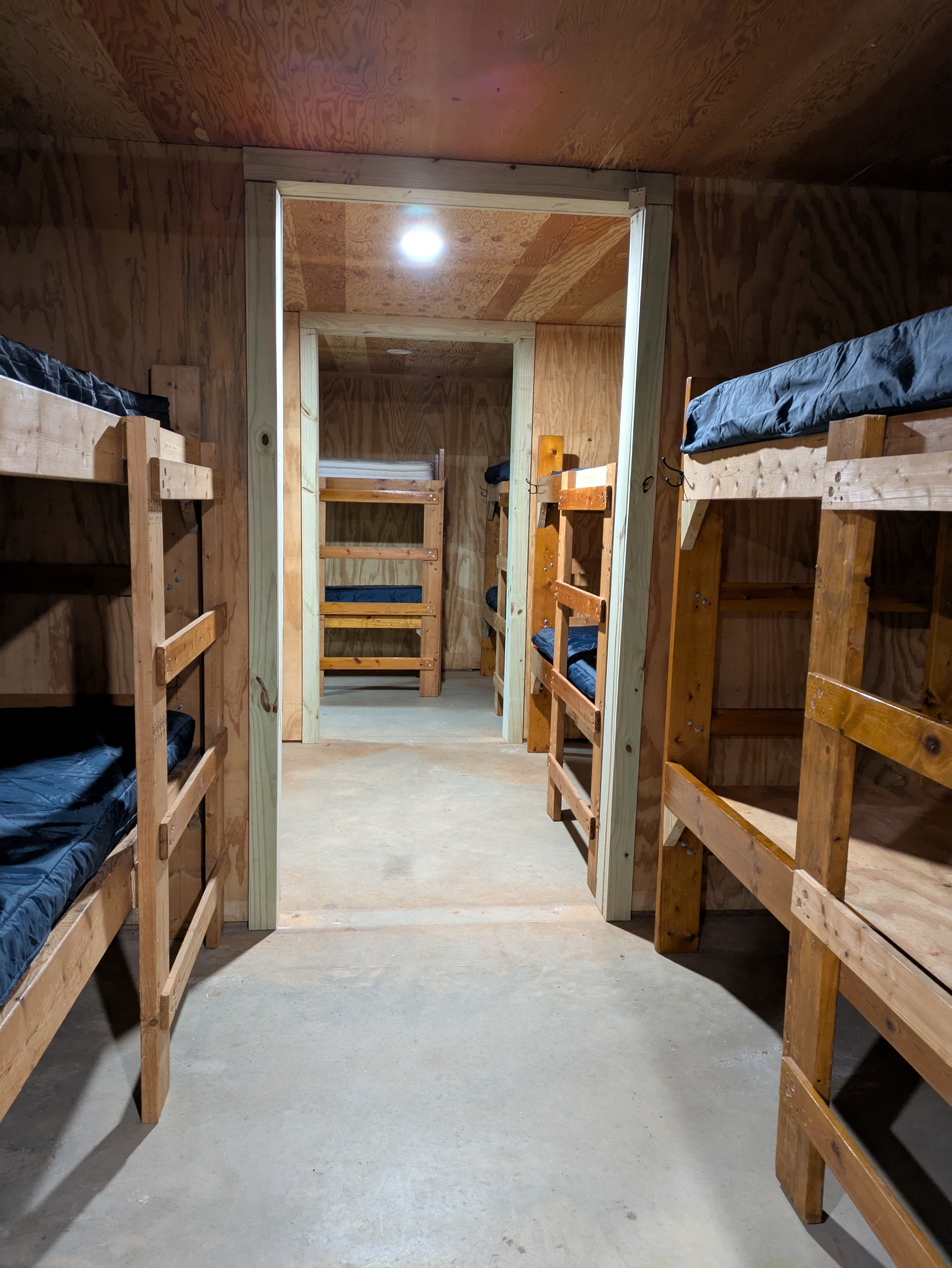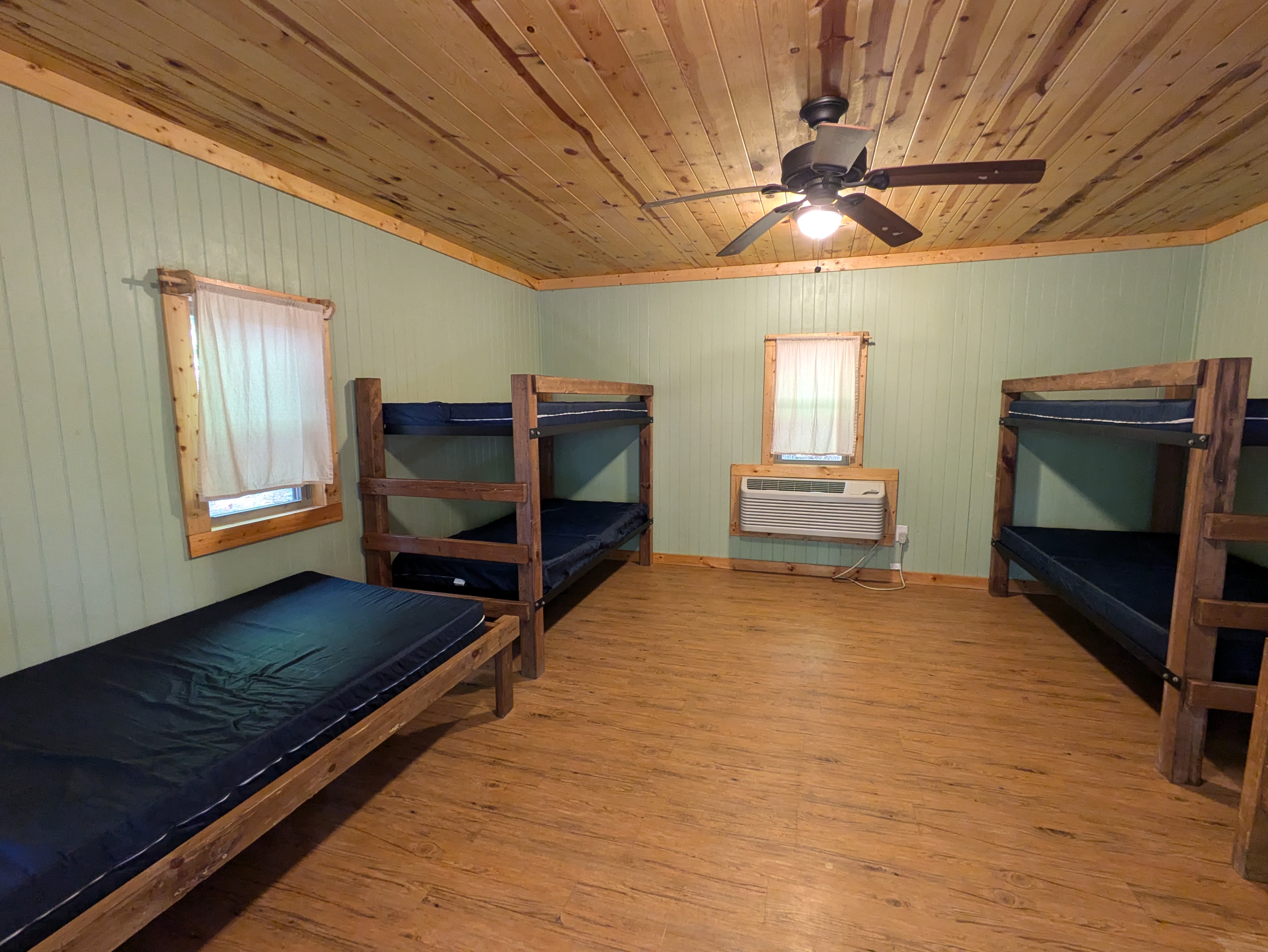 Our newly renovated Bunk House offers comfortable accommodations for up to 42 guests in twin bunk beds. Thoughtfully designed for group stays, the space is divided by a sliding door, allowing for separate areas-each with 21 beds-ideal for accommodating both boys and girls. Each section features a private restroom with a sink and toilet, while the nearby bathhouse provides convenient shower facilities.