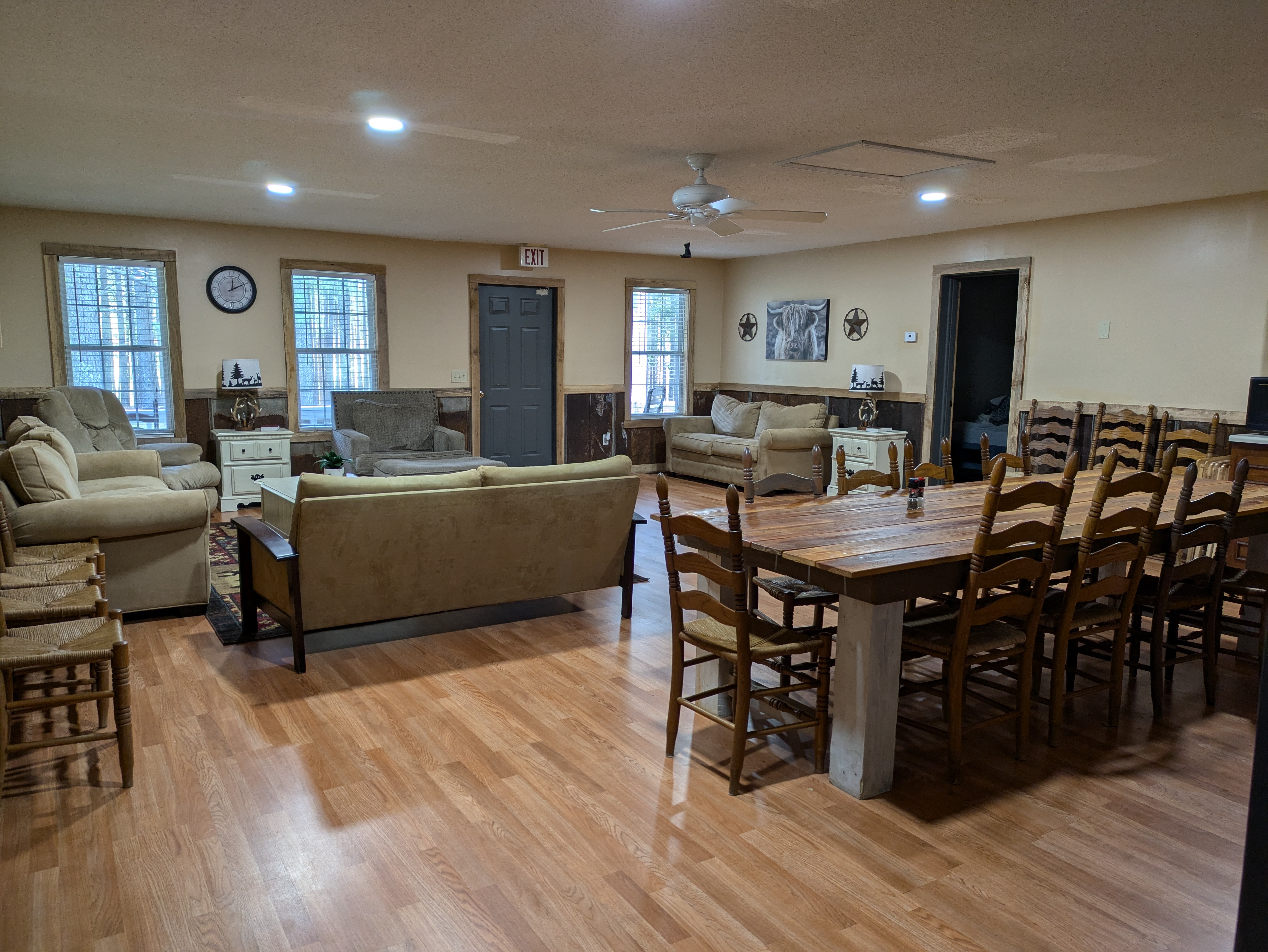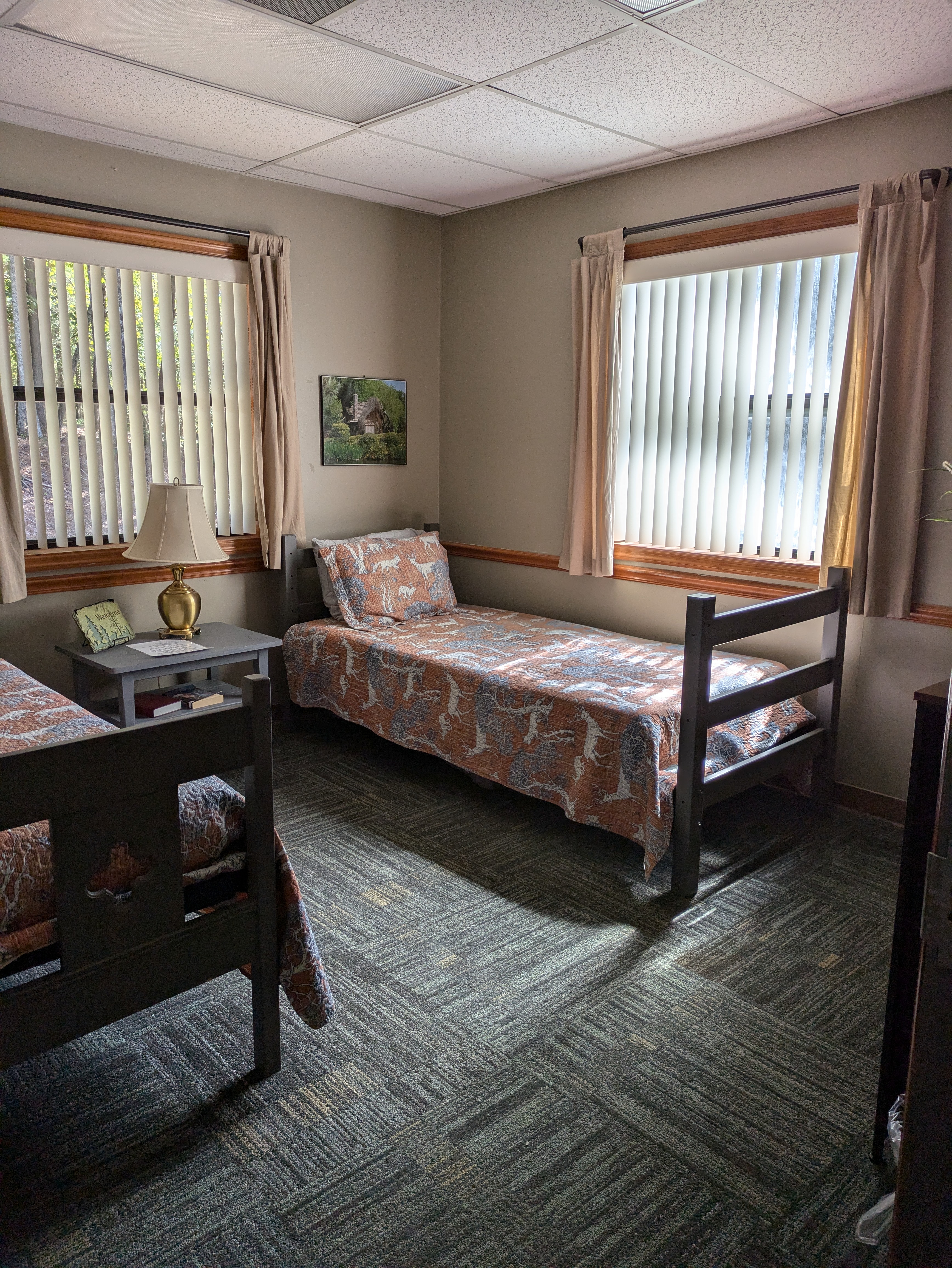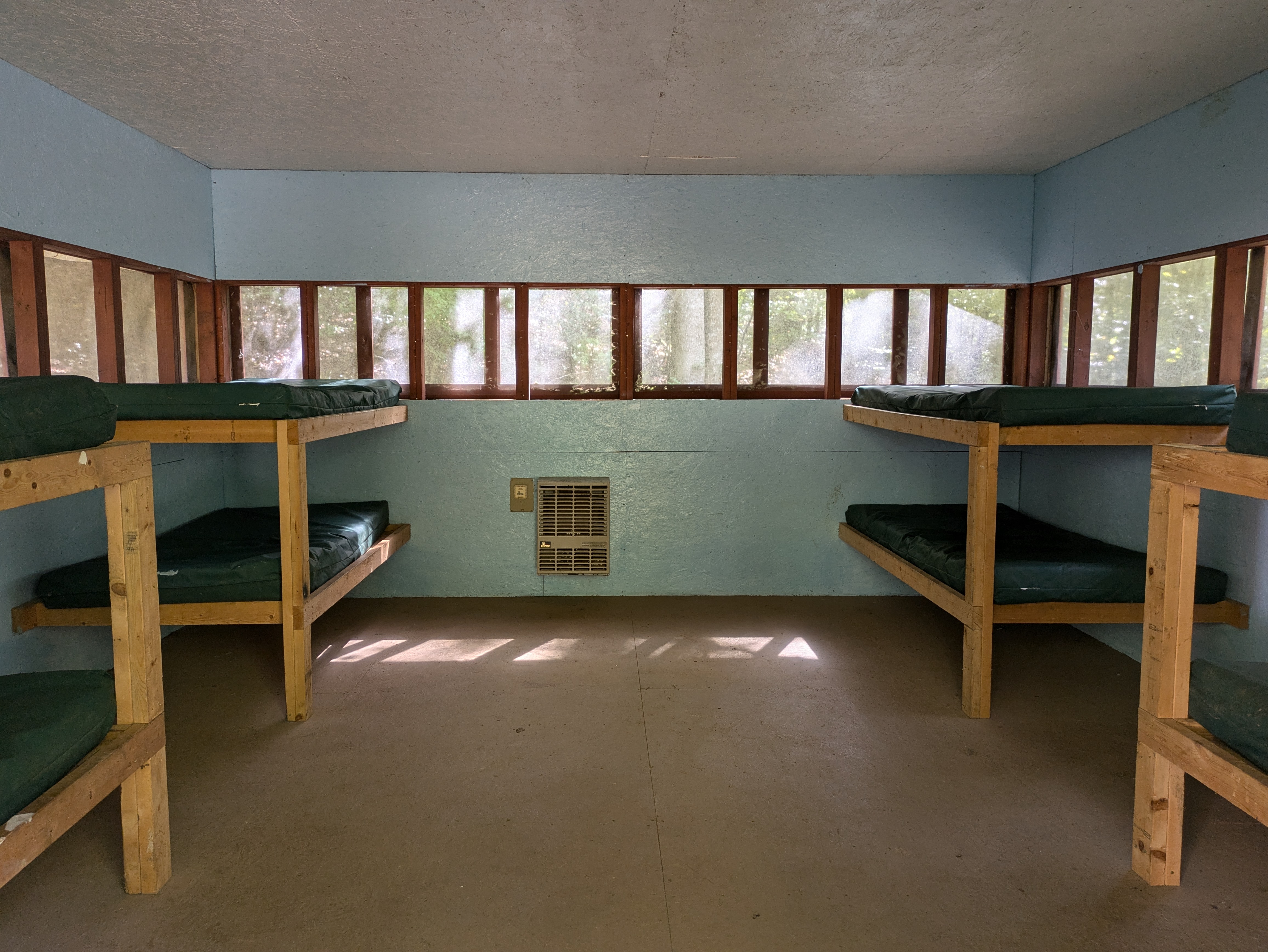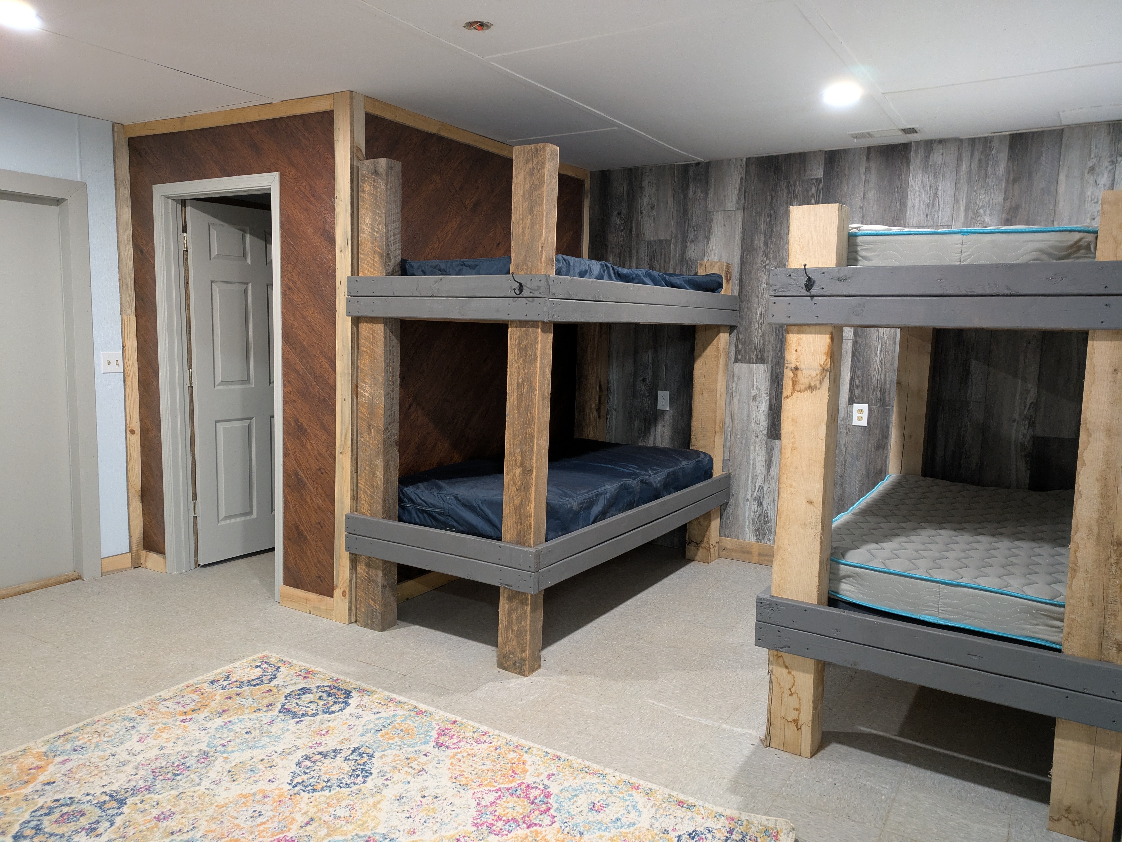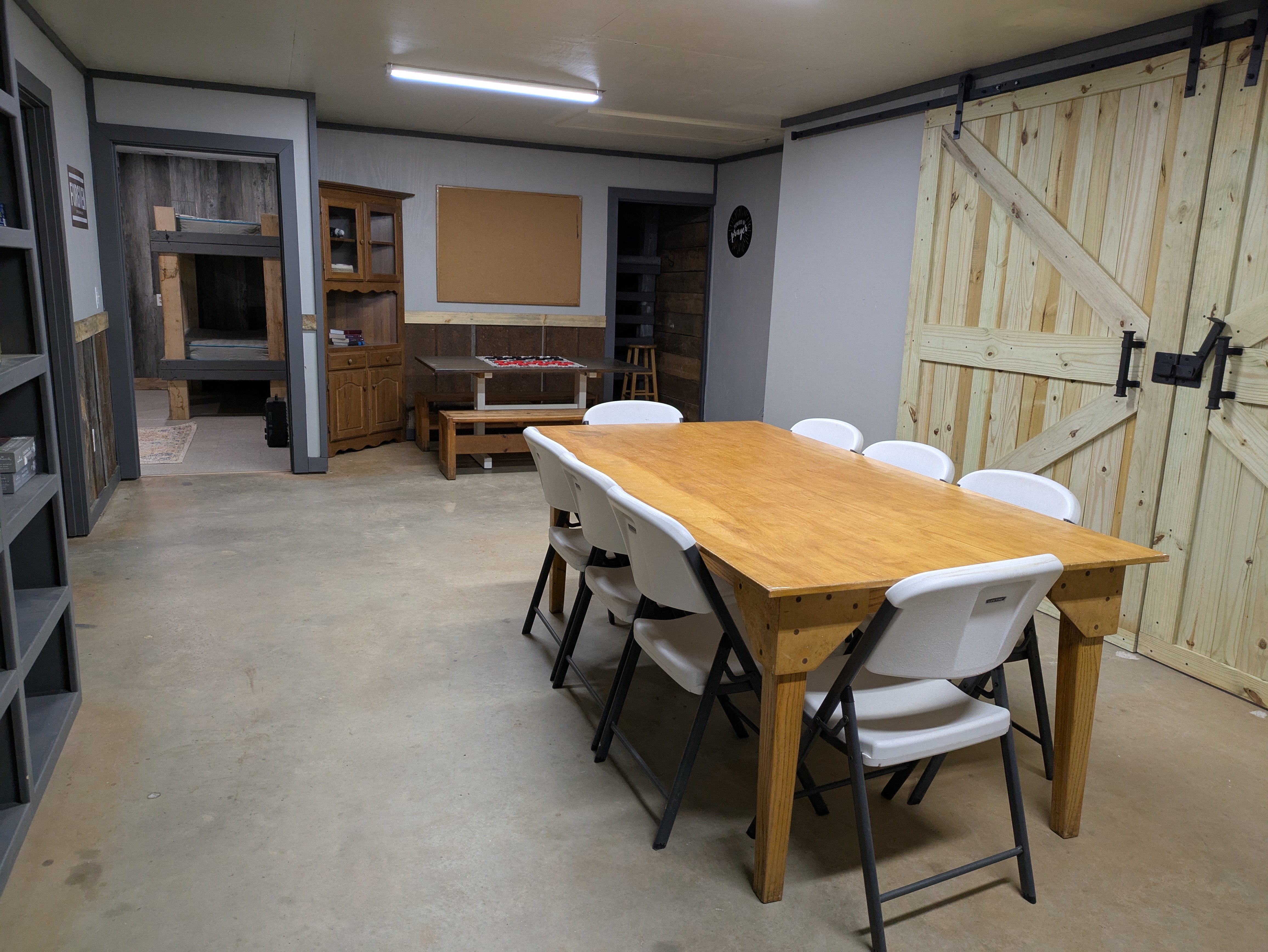 Our newly renovated Bunk House offers comfortable accommodations for up to 42 guests in twin bunk beds. Thoughtfully designed for group stays, the space is divided by a sliding door, allowing for separate areas-each with 21 beds-ideal for accommodating both boys and girls. Each section features a private restroom with a sink and toilet, while the nearby bathhouse provides convenient shower facilities.