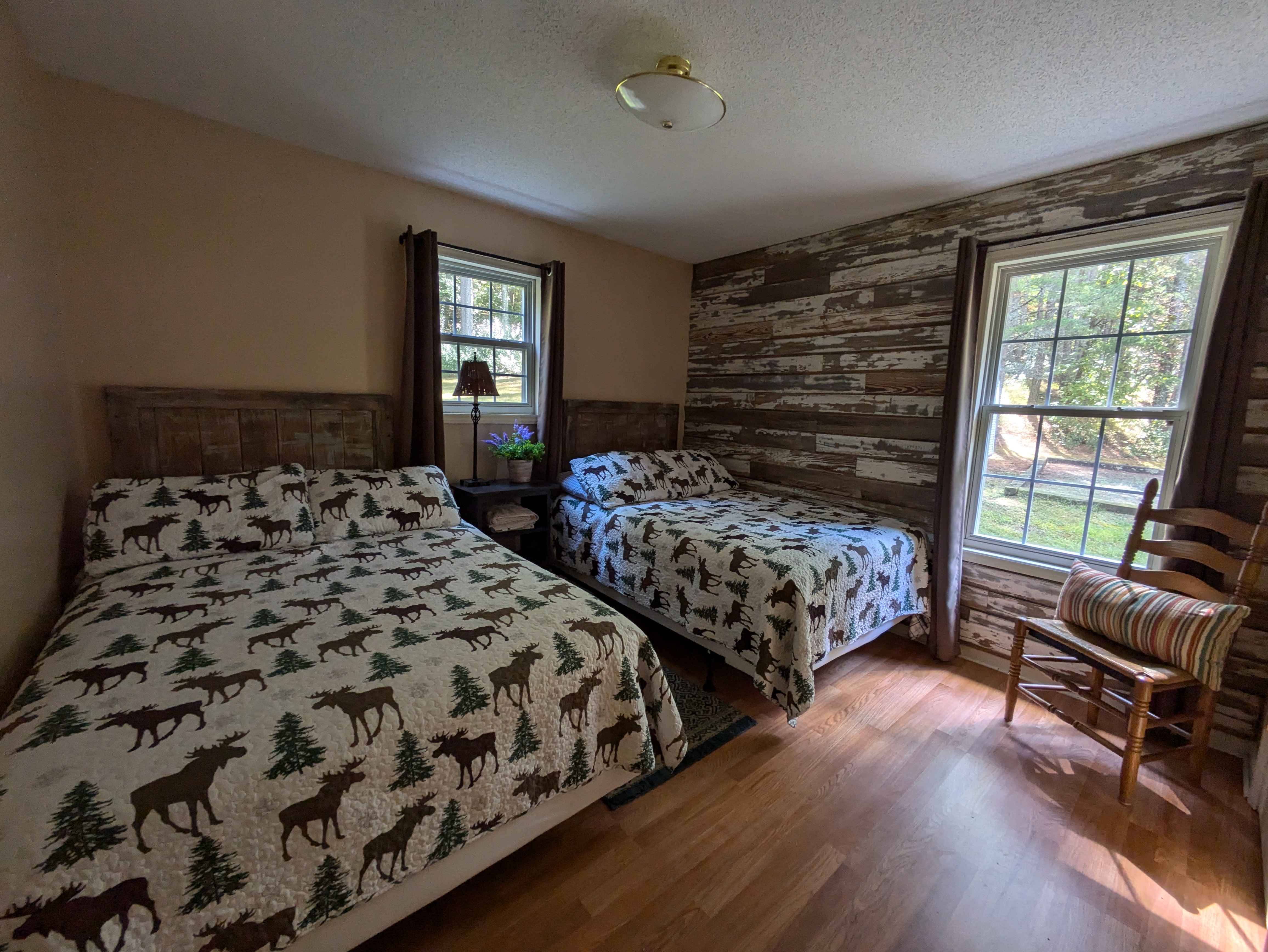 The Lake House offers stunning views of our beautiful lake, where guests can often spot Does with their fawns in the surrounding area. This spacious accommodation features three bedrooms, each equipped with two double beds, ensuring ample sleeping space for families or groups, with a maximum occupancy of six guests.